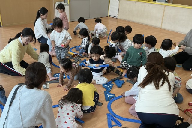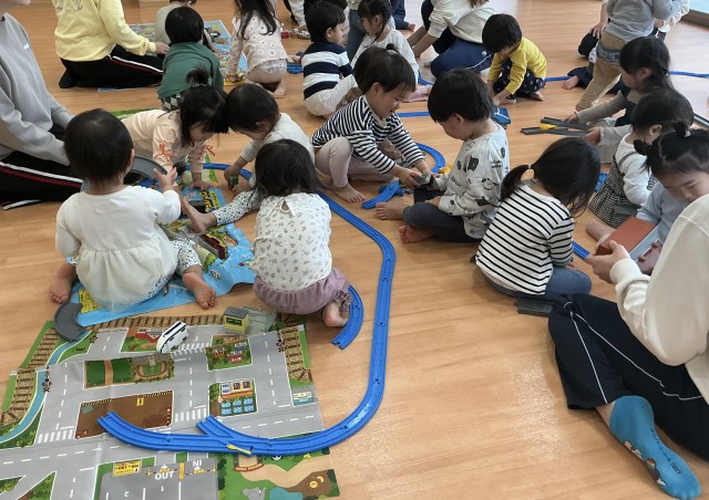 普段よくプラレールで遊んでいるぱんだ組のお友だちに繋げ方を教えてもらったり、手をつないで歩いていたり、前回より交流する姿が多く見られました!